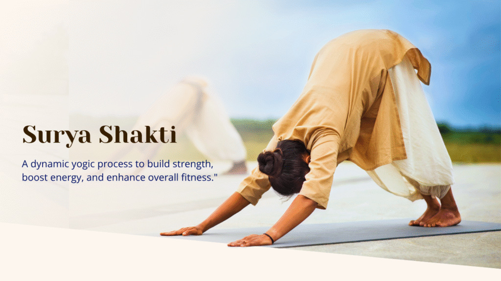 Surya Shakti is a powerful yogic practice designed to energize the body, build strength, and ignite vitality. Often described as a “far-off relative” of Surya Kriya, this dynamic process is focused more on physical fitness and endurance.